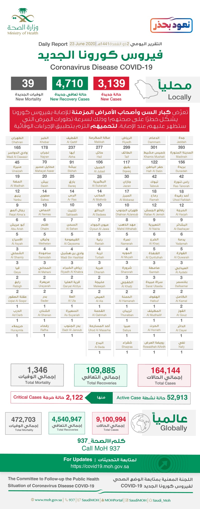 وتم تسجيل 4710 حالات تعافٍ جديدة منها 51 في القطيف و6 بصفوى، لترتفع الحالات الإجمالية للتعافي إلى 109885 حالة «67 % من إجمالي الإصابات المسجلة».