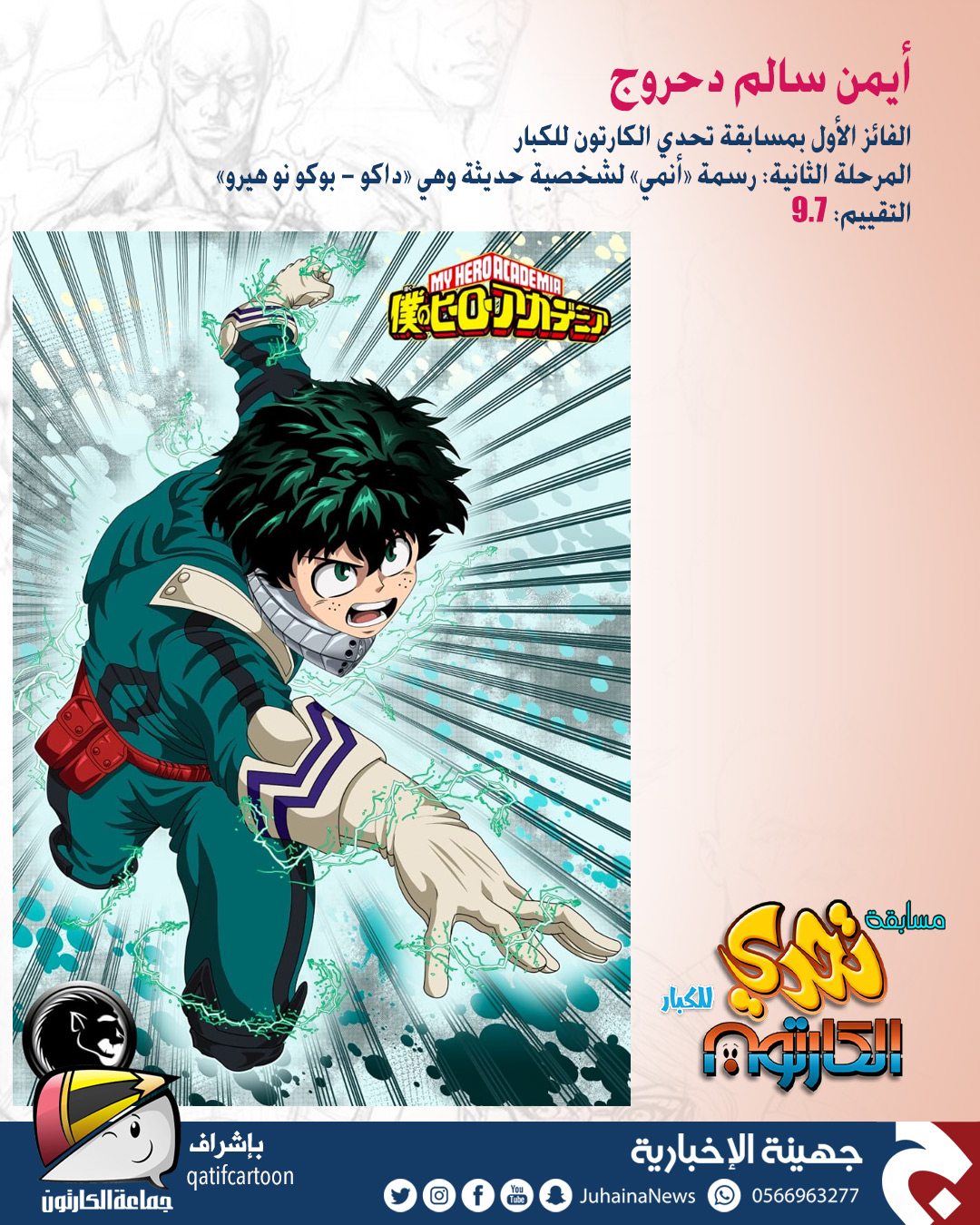 حقّق المتسابق أيمن الدحروج المركز الأول في مسابقة ”تحدي الكارتون“ للكبار التي نظمتها صحيفة جهينة الإخبارية بإشراف جماعة الكارتون.