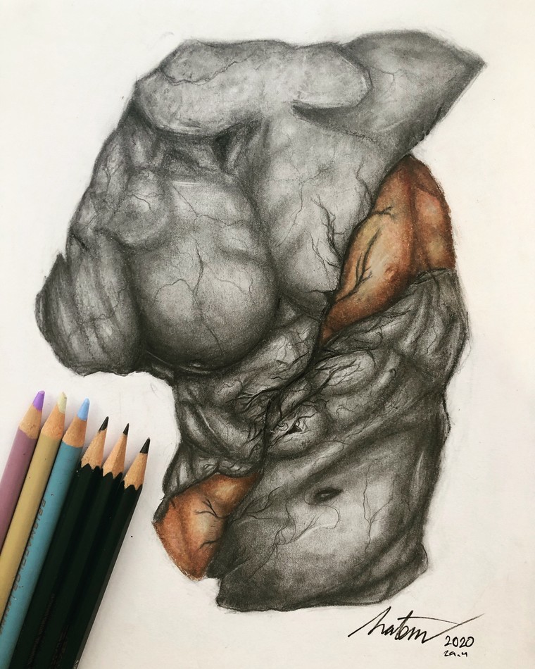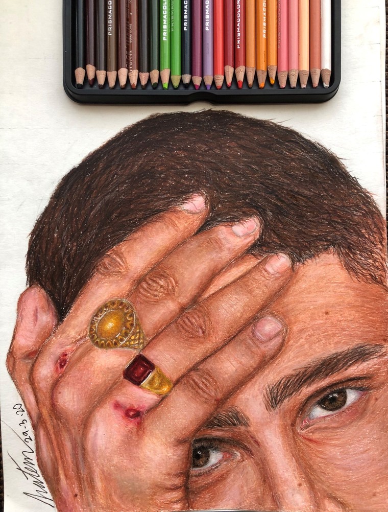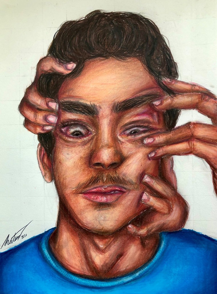 وصلتني رسالة واتساب من أحد افراد العائلة، وكان في تلك الرسالة رابط لأحد حسابات الانستغرام باسم. hatemdoesart في البدء دخلت على الرابط لمجرد المجاملة وربما إبداء الإعجاب ”الالكتروني“ لما ينتظرني على الرابط من أعمال فنية. وفور دخولي اتضح لي أن الحساب لشاب يافع يبلغ من العمر 13 عاما ويدعى حاتم حسين الكاكا وهو الابن البكر لأحد اصدقائي. في تلك اللحظة عرفت، للمرة الأولى، بأن حاتم يعشق الفن ولكن ما أذهلني هو إبداعات هذا الشاب الصغير في مجال الرسم.