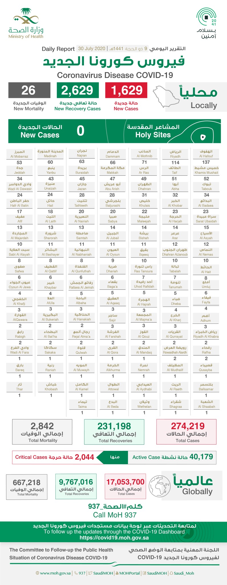 وتم تسجيل 2,629 حالة تعافٍ جديدة منها 55 في القطيف و13 بصفوى، لترتفع الحالات الإجمالية للتعافي إلى 231,198 حالة ”84 % من إجمالي الإصابات المسجلة“.