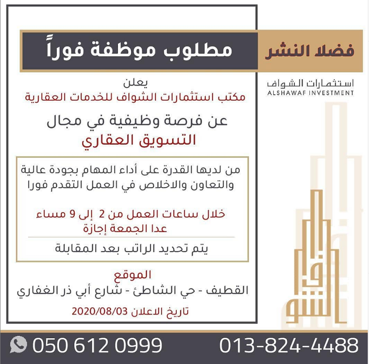 يعلن مكتب استثمارات الشواف للخدمات العقارية عن فرصة وظيفية في مجال التسويق العقاري.