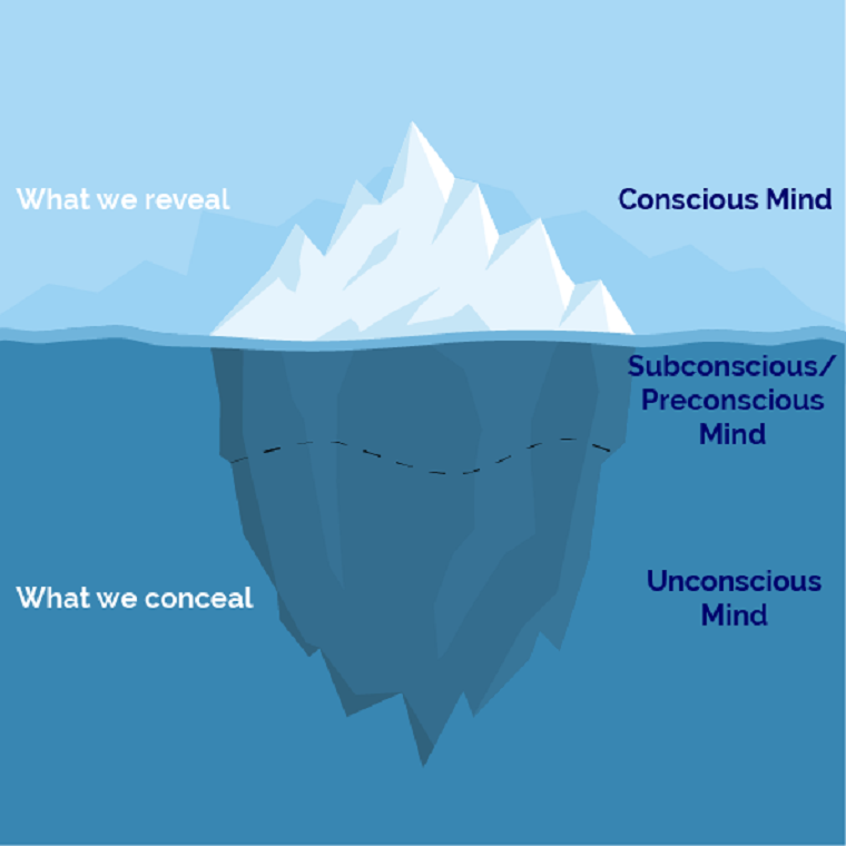 فوق سطح الماء هناك العقل الواعي والذي ينطوي على ما نكشفه عن أنفسنا، والعقل الباطن «دون الوعي» تحت سطح الماء مباشرة وفِي العمق هناك العقل اللاواعي والذي ينطوي على ما نخفيه عن أنفسنا.