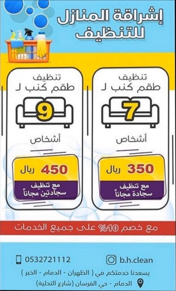 - تنظيف كنب ”9 أشخاص“ = 450 ريال مع تنظيف 2موكيت مجاناً