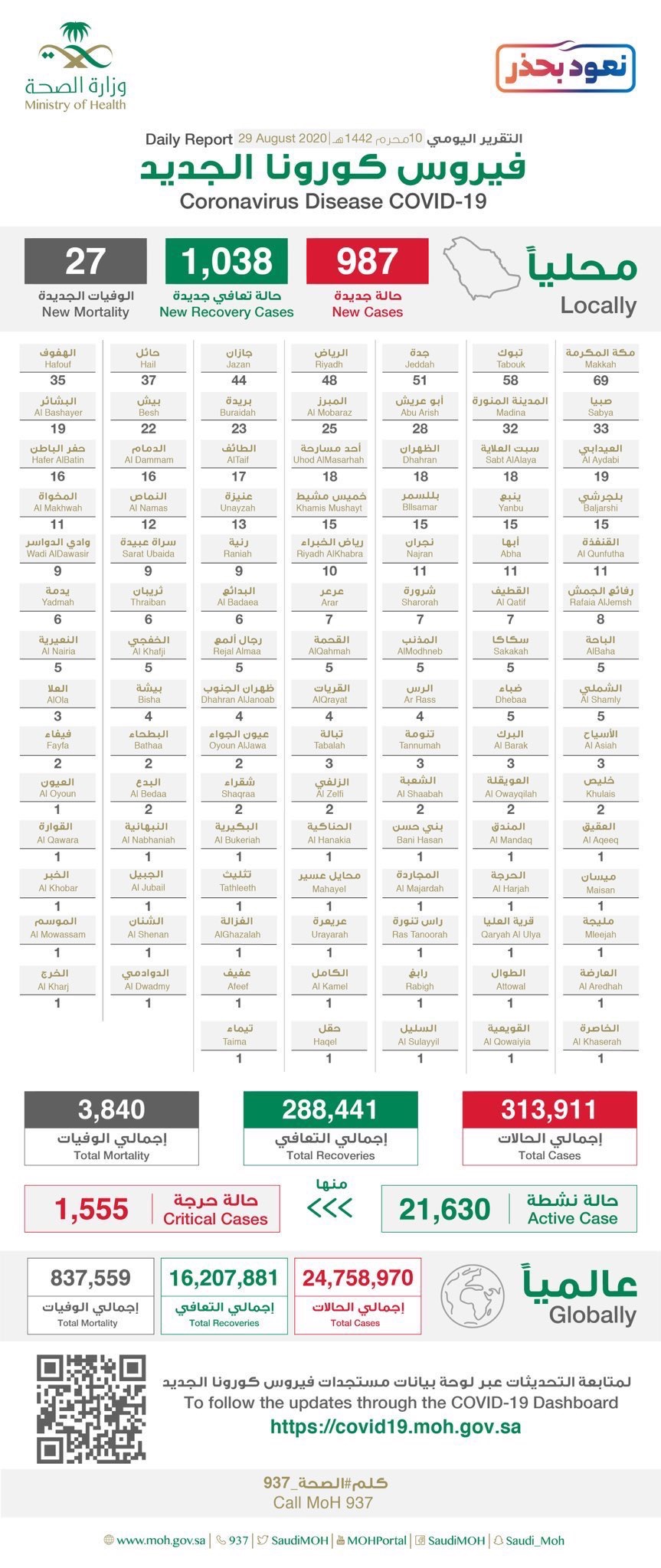 ولمعرفة تفاصيل إجمالي توزيع حالات الإصابة والتعافي، يمكن زيارة الموقع الإلكتروني المخصص من وزارة الصحة للاطلاع على مستجدات الفايروس في المملكة، والإحصاءات اليومية عبر الرابط https://covid19.moh.gov.sa/