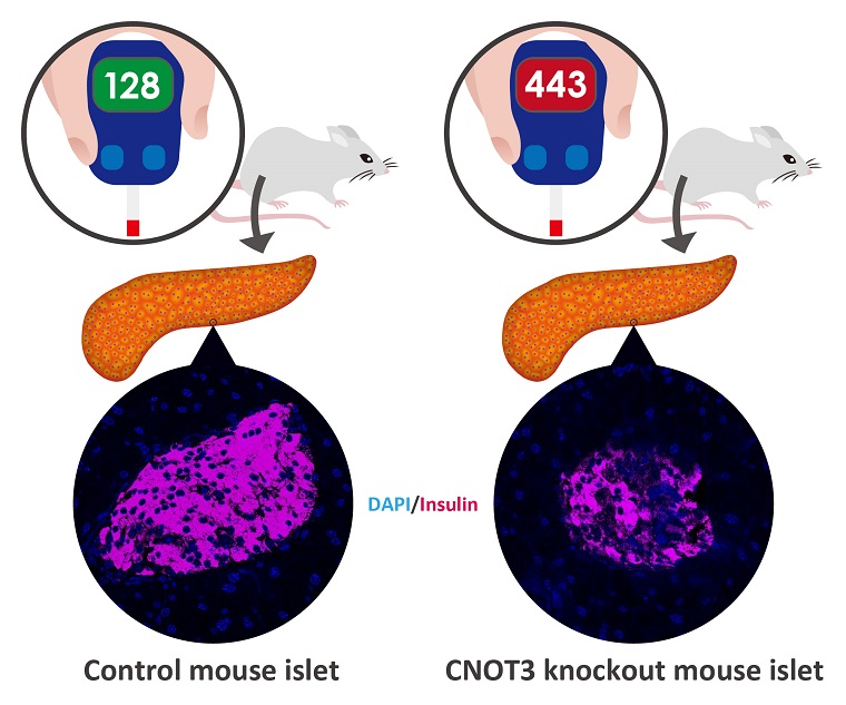 الفئران التي تفتقر إلى بروتيتن ال CNOT3 في خلايا بيتا البنكرياسية لديها عدد أقل من الخلايا المنتجة للأنسولين، مما يؤدي إلى الإصابة بمرض السكري.