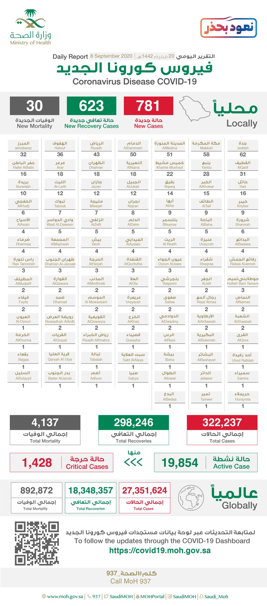 أعلنت وزارة الصحة اليوم ”الثلاثاء“ تسجيل 781 إصابة جديدة بفايروس كورونا المستجد المسبب لمرض ”كوفيد19“. منها 31 في القطيف  و2 بصفوى. ليصبح عدد الحالات المؤكدة في المملكة «322237» حالة.