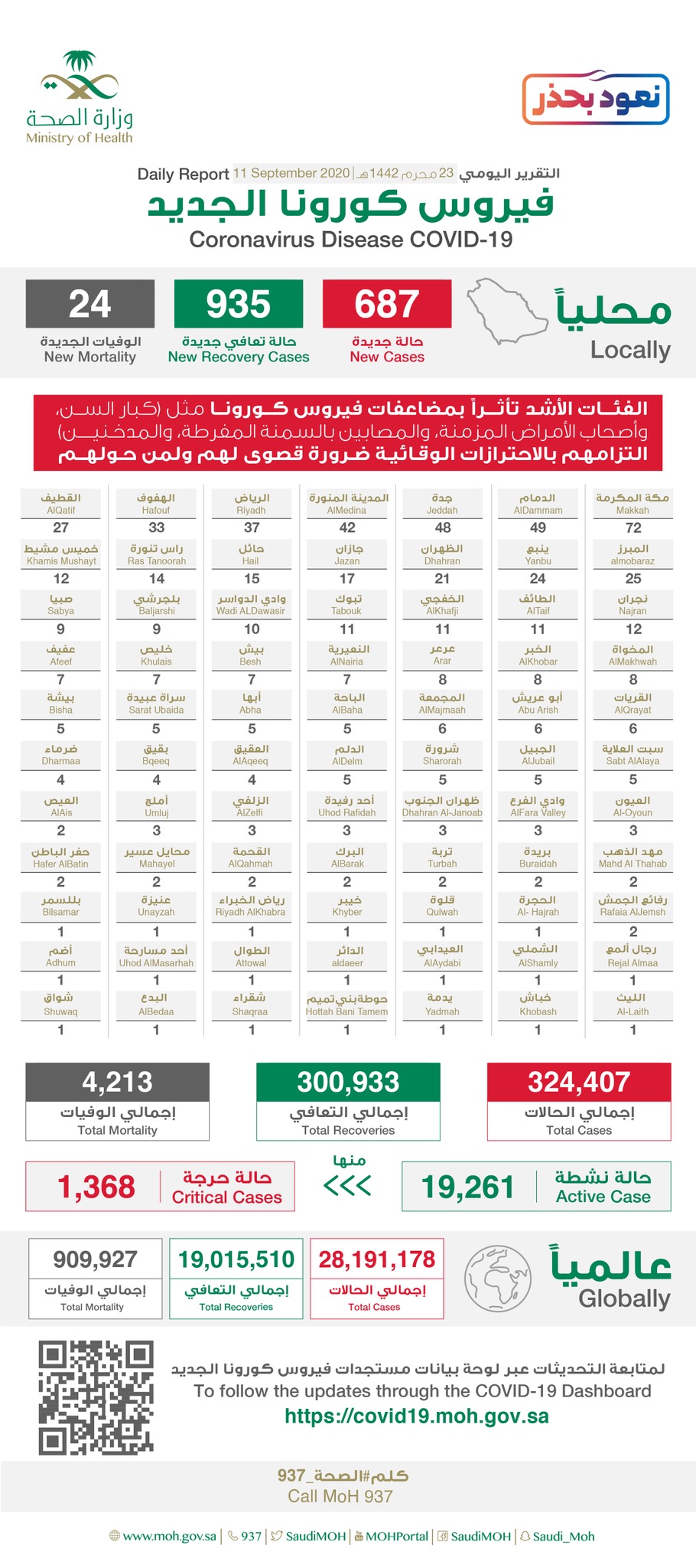 أعلنت وزارة الصحة اليوم ”الجمعة“ تسجيل 687 إصابة جديدة بفايروس كورونا المستجد المسبب لمرض ”كوفيد19“. منها 27 في القطيف وصفر بصفوى. ليرتفع إجمالي الإصابات في المملكة إلى 324407 حالة مؤكدة.