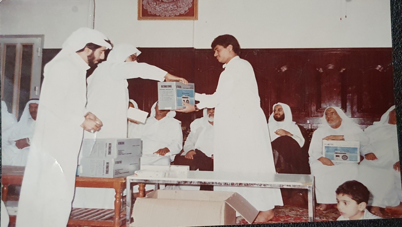 في هذه الصورة من اليسار المترجم له ”ابراهيم“، الأستاذ عبدالكريم بوخمسين، ويظهر في الجلوس سماحة العلامة الشيخ باقر، والشيخ حسين بوخمسين