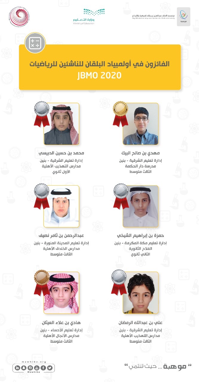 حقق 6 طلبة سعوديون من طلبة مؤسسة الملك عبدالعزيز ورجاله للموهبة والإبداع ”موهبة“ بالشراكة مع وزارة التعليم إنجازًا غير مسبوق في أولمبياد البلقان للناشئين للرياضيات 2020 الذي نفذ هذا العام ”عن بعد“ بسبب جائحة كورونا.