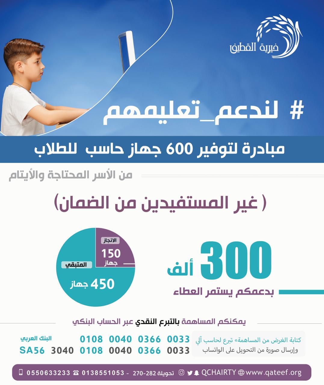 أنهت جمعية القطيف الخيرية المرحلة الأولى من مبادرة لندعم تعليمهم بتأمين 150 حاسب مكتبي ”ديسك توب“ من مجموع 600 جهاز، دعمًا للطلاب من الأسر المحتاجة والأيتام غير المستفيدين من الضمان.
