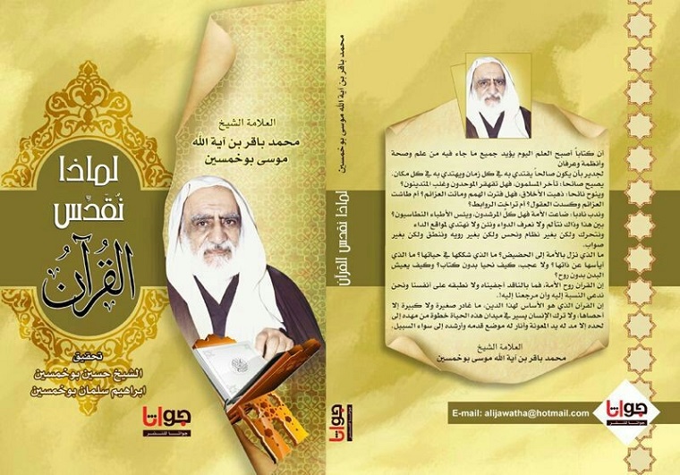 وبعد الإلحاح وافقوا فعكفت عليه ”صورة رقم 1“ وشحذت همتي وعاهدت نفسي بأن لا القي عصى الترحال في التحقيق إلا بعد أن أتمم العمل فيه، كانت فيه أبواب في القسم الأخير لم تكتمل فأخذت الأذن من سماحة العلامة الشيخ حسن بوخمسين في إكمالها بنفس الأسلوب الذي استخدمه والده الشيخ في بحثه. وبعد أن اكتمل التحقيق تمت المراجعة من قبل سماحة الشيخ عبدالله بن الشيخ حسن وسماحة الشيخ حسين بن عبدالهادي بوخمسين وتحت رعاية الشيخ حسن بن العلامة الشيخ باقر وتم اقرار جميع الملاحظات. يعتبر هذا الكتاب أفضل مؤلفات العلامة الشيخ باقر بوخمسين تناول فيه واحدا واربعين موضوعا، ويعتبر من التفاسير الموضوعية في القرآن الكريم ومن أبوابه: ما هو القرآن، المشاريع الخيرية في القرآن، الدولة وشؤونها في القرآن، الطقوس الدينية في القرآن، الحقوق الشخصية في القرآن، الرق في القرآن، حقوق الحيوان في القرآن...، الكتاب قيم جدا بشهادة كل من آية الله الدكتور الفضلي وآية الله الشيخ باقر شريف القرشي وقد أوردت كلتي الشهادتين في دراستي الأدبية للشيخ باقر والتي شاركت بها لكتاب سوف يصدر قريبا عن حياته.