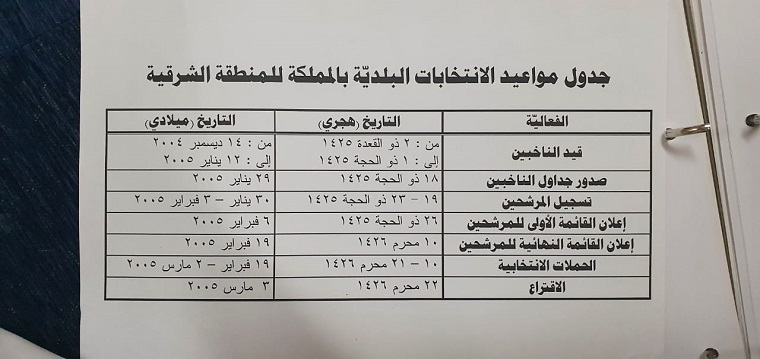 ما بين ذي القعدة سنة 1425 هـ ”قيد الناخبين“ إلى المحرم 22 سنة 1426 هـ، شهدت محافظة الأحساء حراكا محموما على أول انتخابات مجلس بلدي رسمية في بلدنا المملكة العربية السعودية. الحدث جديد بكل المقاييس وهو نقلة نوعية تجعل الناس لهم الحق باختيار ممثليهم في المجلس البلدي والتصويت، وكانت الدورة الأولى مقصورة على الذكور فقط. كانت الأحساء بمدنها وبقراها ست دوائر سيمثلها ستة مرشحين، وكان للناخب الحق بالتصويت في جميع الدوائر بخلاف الدورات الحالية فإن التصويت فقط في محيط الدائرة التي يقطن فيها الناخب. كان الصراع محموما بين مكونات المجتمع والاصطفافات، كل يريد جر القرص إلى ناره، ارتأت مجموعة من ناشطين المجتمع والوجهاء والخطباء ورجال الدين والأكاديميين ورجال الأعمال بالوقوف ودعم ممثليهم في الانتخابات كباقي ناشطي المجتمع في طول وعرض المحافظة، والمساهمة ببث الوعي بهذه التجربة الجديدة بشكل مباشر وغير مباشر، وبدأت عجلة العمل بالسير. إنها ثقافة جديدة دخلت بيوتنا وحياتنا وفكرنا وعلينا التعامل معها بحذر إذ أن إرساء القاعدة في كل عمل جمعي هو أساس النجاح على عكس الاختلاف وحب المصالح الفردية والآنية فهو أساس الفرقة وبالتالي الفشل وهو ما كاد يحصل، وحصل بعد ذلك في الدورات التالية. نعود لدورتنا الأولى فقد تصدت هذه الكوكبة المذكورة لتثقيف الناس وتعليمهم بهذه الانتخابات الجديدة. وقد أخذوا على عاتقهم تعريف الناخبين وتذكيرهم بأهمية المشاركة وتذكيرهم بالمواعيد الواردة في جدول مواعيد الانتخابات ”صورة رقم 4“.