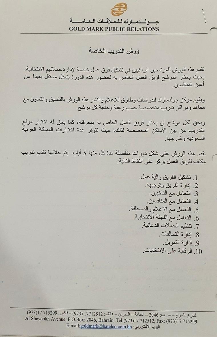 عملت المجموعة بتوفير الورش ”صورة رقم 5“ التثقيفية للمرشحين لتعليمهم بمتطلبات وقوانين وأنظمة الانتخابات والتعامل مع الجمهور في المخيمات الانتخابية. كما تم اصدار نشرات تلخص جدول ومواعيد التسجيل والتصويت وتثقيف الناس وحثهم على التسجيل في قيد الناخبين إذ أن هذه المرحلة من اهم مراحل الانتخابات.