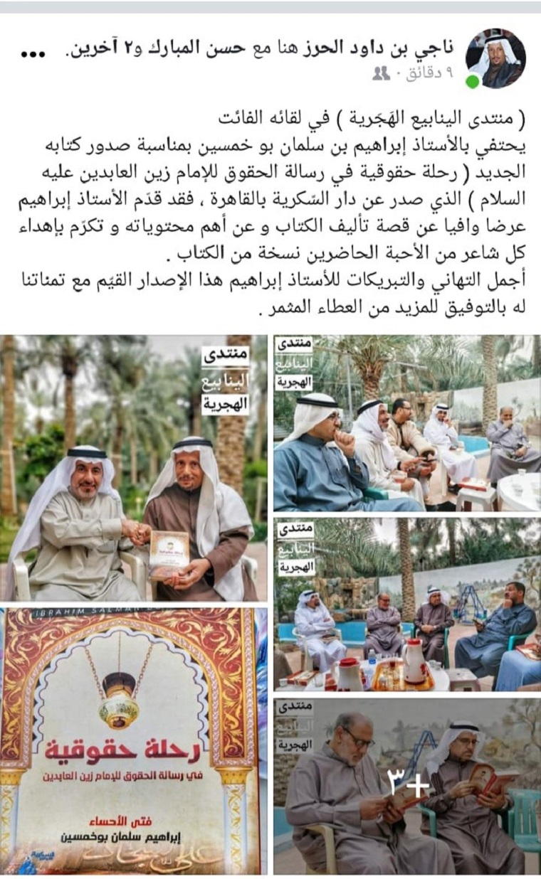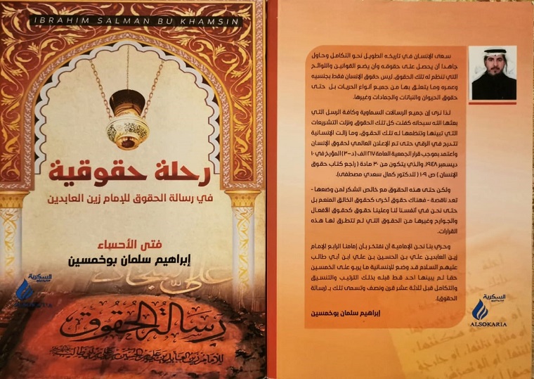 دفعني حبي للإمام زين العابدين ومظلوميته وما تركه لنا من كنور معرفية وأسرار الهية في رسالته الحقوقية والصحيفة السجادية، ومن الكنوز اللغوية التي مهما أوتي أي انسان من فصاحة وبلاغة وعلم لسبر أغوارها فسيكون عاجزا. أحببت أن اقدم خدمة قليلة لهذا الإمام وللأحبة القراء فراودتني في السنوات الأخيرة فكرة شرح رسالة الحقوق لمولانا زين العابدين بطريقة واسلوب غير المتبع في الشروحات الموجودة. عمدت في بحثي هذا بأن آتي ببعض سيرة الإمام بما يناسب ذلك الحق وبعض الشعر، ومن ثم تعريف لغوي من معاجم اللغة وبعض الإحصائيات من القرآن بما يخص كل حق إن وجد، ثم الشروع في الشرح والتحليل. وكذلك بالاستشهاد ببعض المراجع والكتب لمؤلفين وشعراء أحسائيين. نشرت هذه على شكل حلقات في صفحتي على الفيس بوك. ولما رأيتها شارفت على الأربعمائة صفحة قررت أن أطبعها كجزء أول. فعمدت الى مدقق ومخرج لتدقيقها وإخراجها فجاءت في حلة جميلة، وصدرت الكتاب بتخميس جميل للشاعر الجميل الأستاذ ناجي الحرز ”صورة رقم 7“ لقصيدة الفرزدق الميمية المشهورة ومنها: