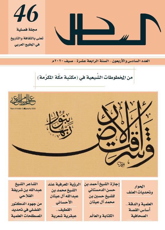 صدر حديثًا العدد السادس والأربعون من مجلّة الساحل «السنة الرابعة عشرة - صيف 2020م»، واحتوى على عدد من المقالات التي تناولت تاريخ المنطقة الشرقية وتراثها خصوصًا، وشؤون الخليج العربي وشجونه وتراثه عمومًا، وتصدّرت الغلاف لوحة خطّية من إبداع الفنّان «أحمد حسن أبو سرير» احتفاءً بعام الخط العربي كما أعلنته وزارة الثقافة في المملكة العربية السعودية.