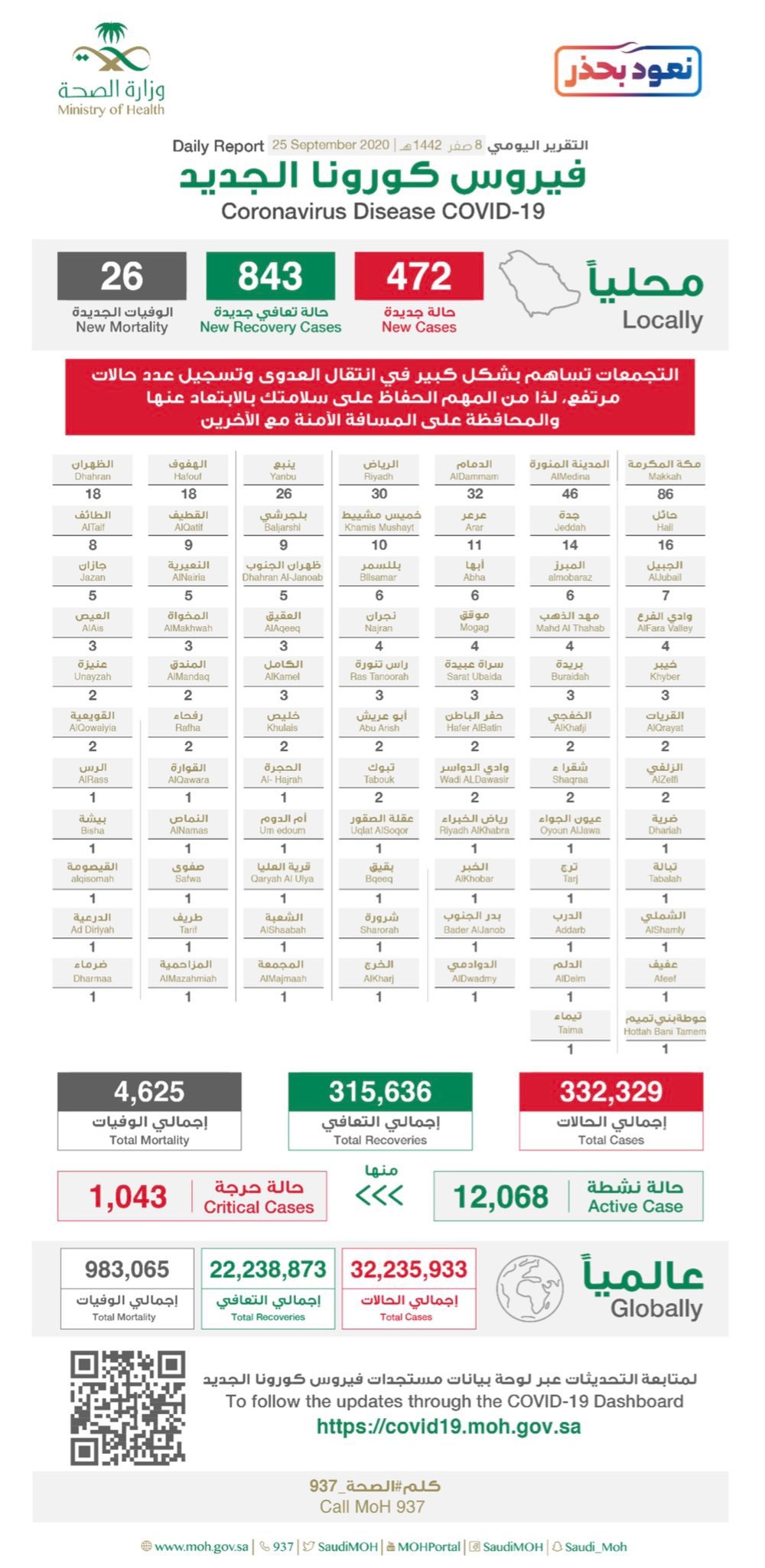وتم تسجيل 843 حالة تعافٍ جديدة منها 32 في القطيف و8 بصفوى، لترتفع الحالات الإجمالية للتعافي إلى 315636 حالة، (95 % من إجمالي الإصابات المسجلة).