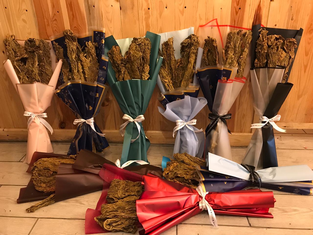 عوضا عن الزهور الطبيعية أهدى بائع تبغ من مدينة سنابس بمحافظة القطيف زملاءه ومعارفه باقات من التبغ الخام ”التتن“ غالي الثمن والشحيح في السوق المحلي.