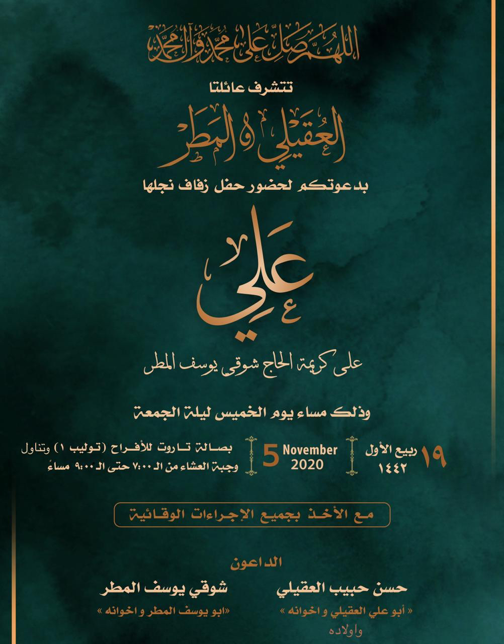 تحتفل عائلة العقيلي مساء الخميس بزفاف ابنها علي حسن العقيلي من كريمة الحاج شوقي يوسف المطر في صالة تاروت للأفراح «توليب 1» بحضور جمع من الأهل والأصدقاء والمحبين.
