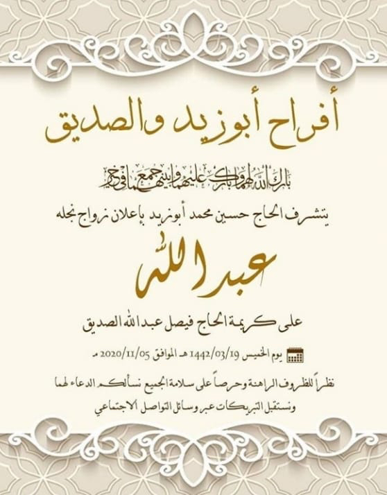 تحتفل عائلة أبو زيد مساء الخميس بزفاف ابنها عبدالله حسين أبو زيد من كريمة الحاج فيصل عبدالله الصديق.