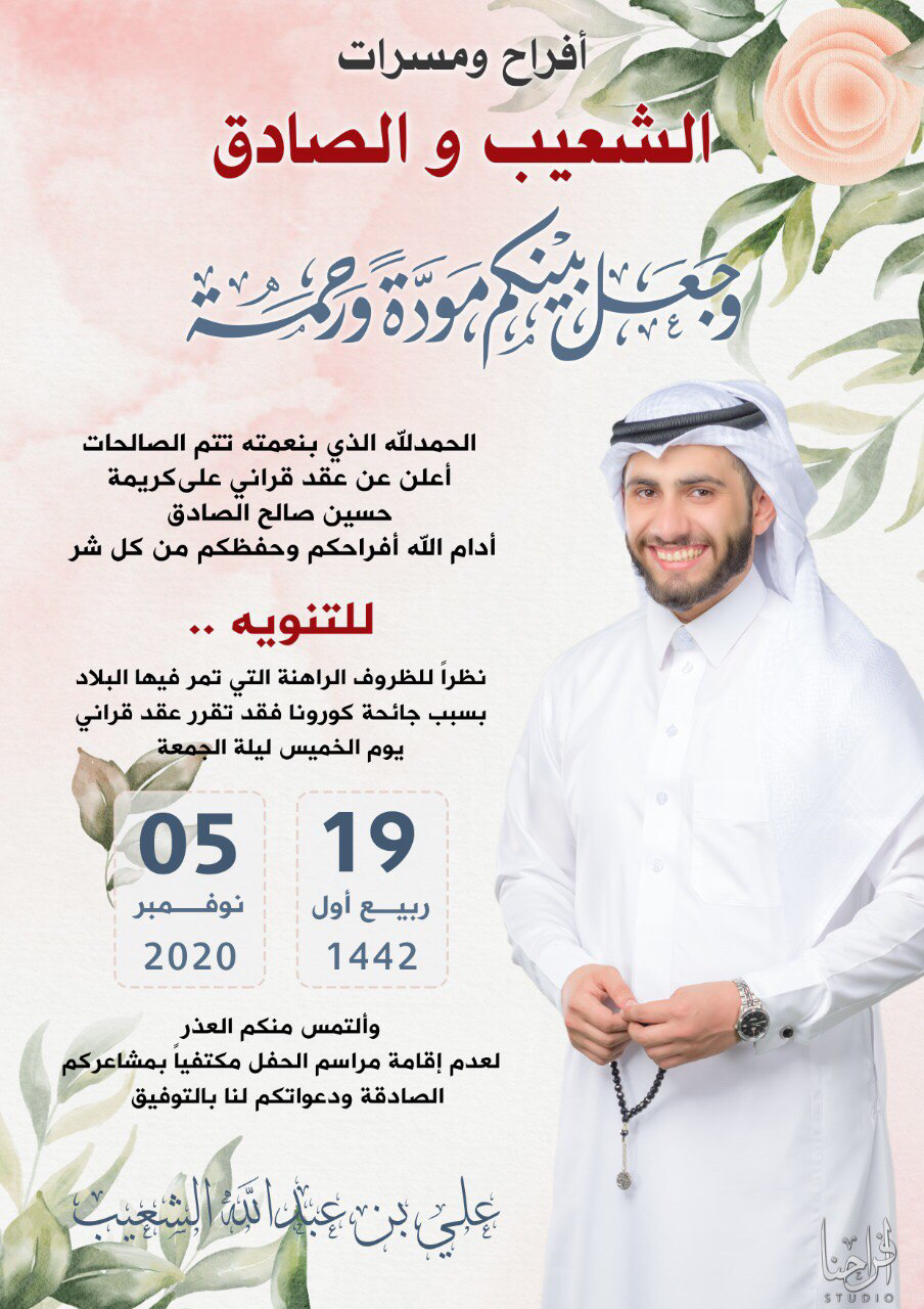 احتفلت عائلة الشعيب في مدينة صفوى مساء الخميس بعقد قران ابنها علي عبدالله الشعيب على كريمة الحاج حسين صالح الصادق، وسط فرحة الأهل والأصدقاء ومحبي العريسين، الذين قدموا لهما التهاني والتبريكات.