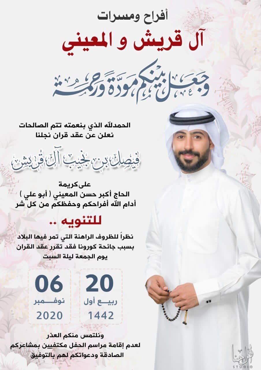 احتفلت عائلة آل قريش في صفوى بعقد قران ابنها فيصل نجيب آل قريش على كريمة الحاج أكبر حسن المعيني، وسط فرحة الأهل والأصدقاء ومحبي العريسين، الذين قدموا لهما التهاني والتبريكات.