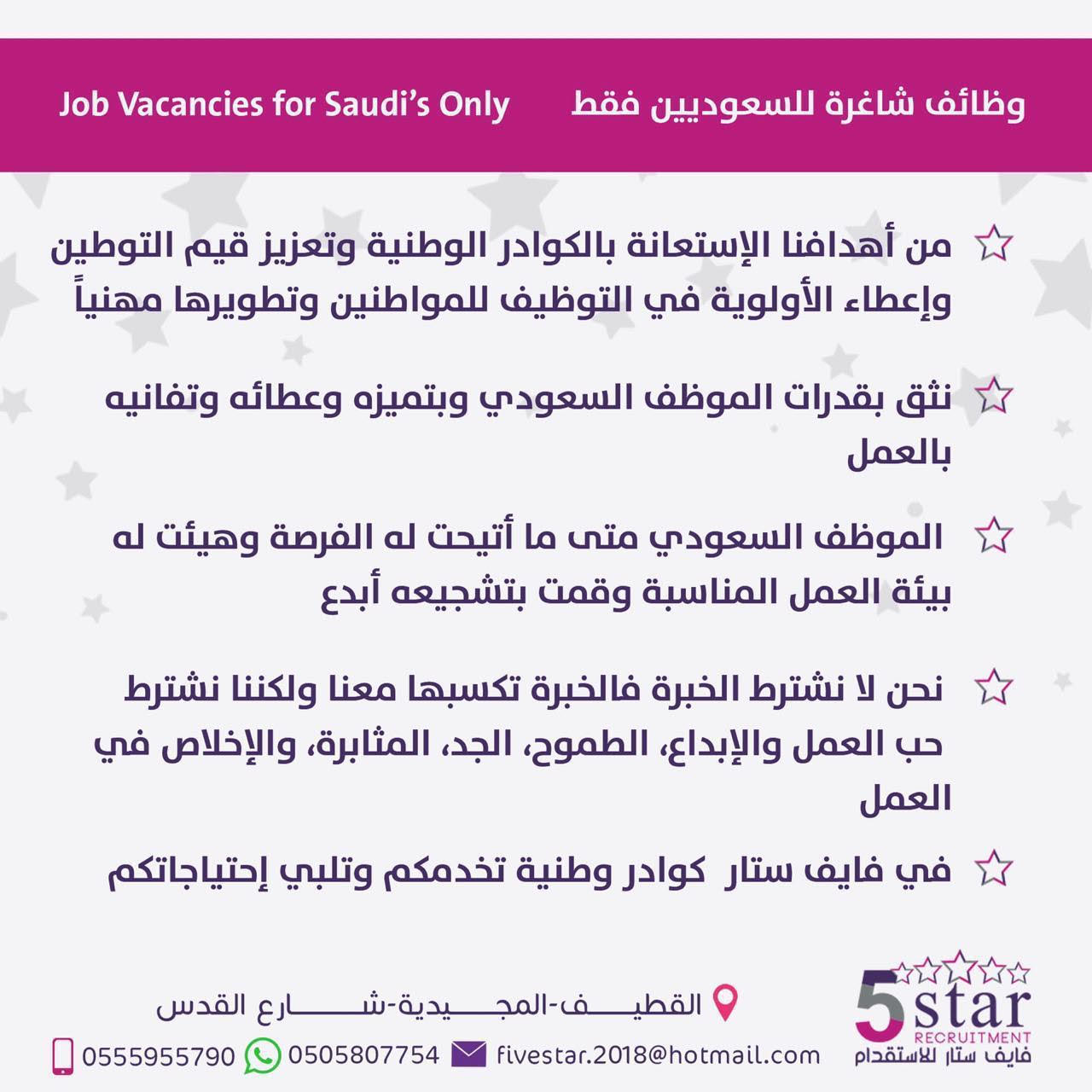 أعلن مكتب فايف ستار للاستقدام بالقطيف عن حاجته لشغل الوظائف التالية: