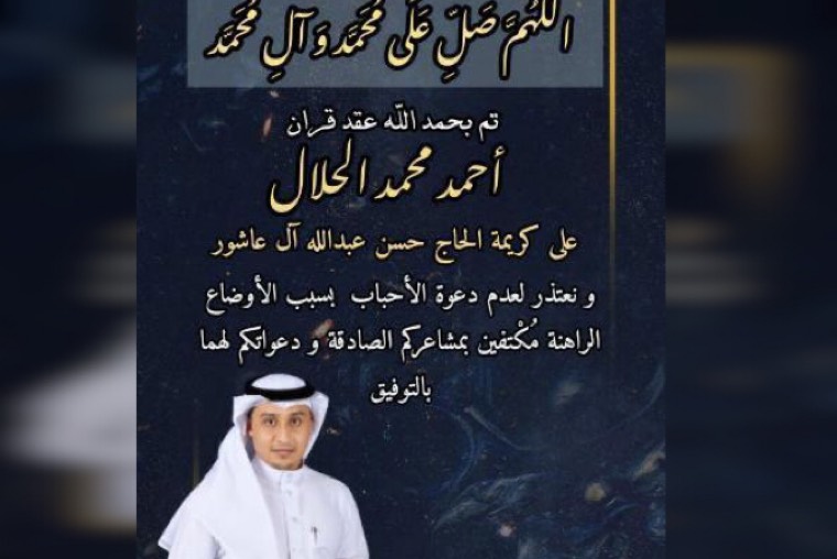 احتفلت عائلة الحلال وآل عاشور في سيهات بعقد قران الشاب أحمد محمد الحلال على كريمة الحاج حسن عبدالله آل عاشور وسط فرحة الأهل والأصدقاء ومحبي العريسين.