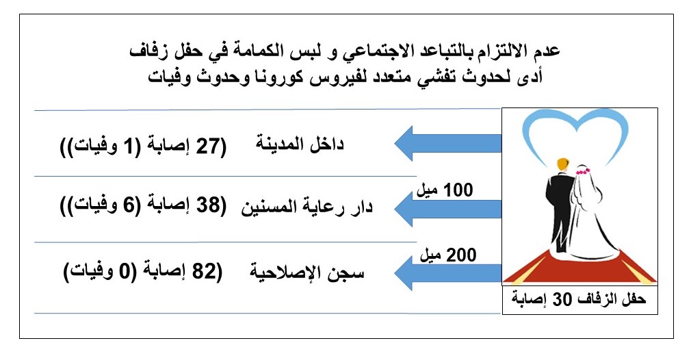 نَشَرَ مركز السيطرة على الأمراض الأمريكي «CDC»، الذي يُعنى برصد ومتابعة الحالات المصابة بفيروس كورونا، تقريراً في 13-11-2020 م حول إصابة 177 شخصاً خلال 38 يوماً بعد حضور بعضهم حفلَ زواج، مات منهم سبعة، وأُدخل سبعةٌ آخرون للمستشفى.