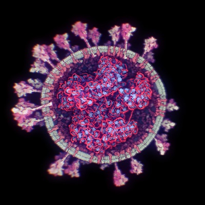عًمل التصوير العلمي بنموذج ثلاثي الأبعاد والذي يجمع بين أحدث البيانات عن بنية فيروس سارس - كوف-2 الذي يسبب جائحة كوفيد-19.