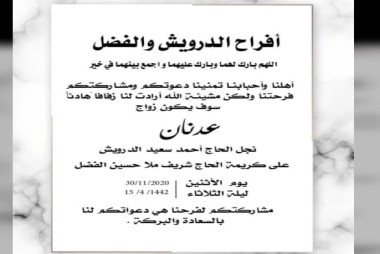 احتفلت عائلة الدرويش والفضل في تاروت مساء يوم الإثنين بزفاف ابنها الشاب عدنان أحمد سعيد الدرويش على كريمة الحاج شريف بن الملّا حسين الفضل. وسط فرحة الأهل والأصدقاء ومحبي العريسين.