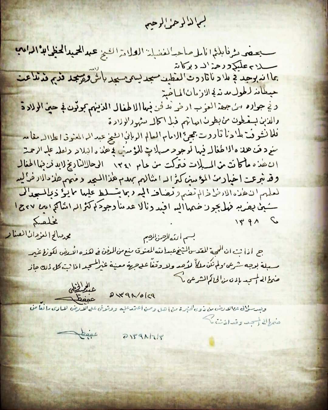 وبعد سؤالي عن الأرض من ذوي الخبرة من أهل وممن اعتمد عليه ووقوفي على الأرض لا أرى مانعا من ضمها إلى المسجد وقد أذنت.
