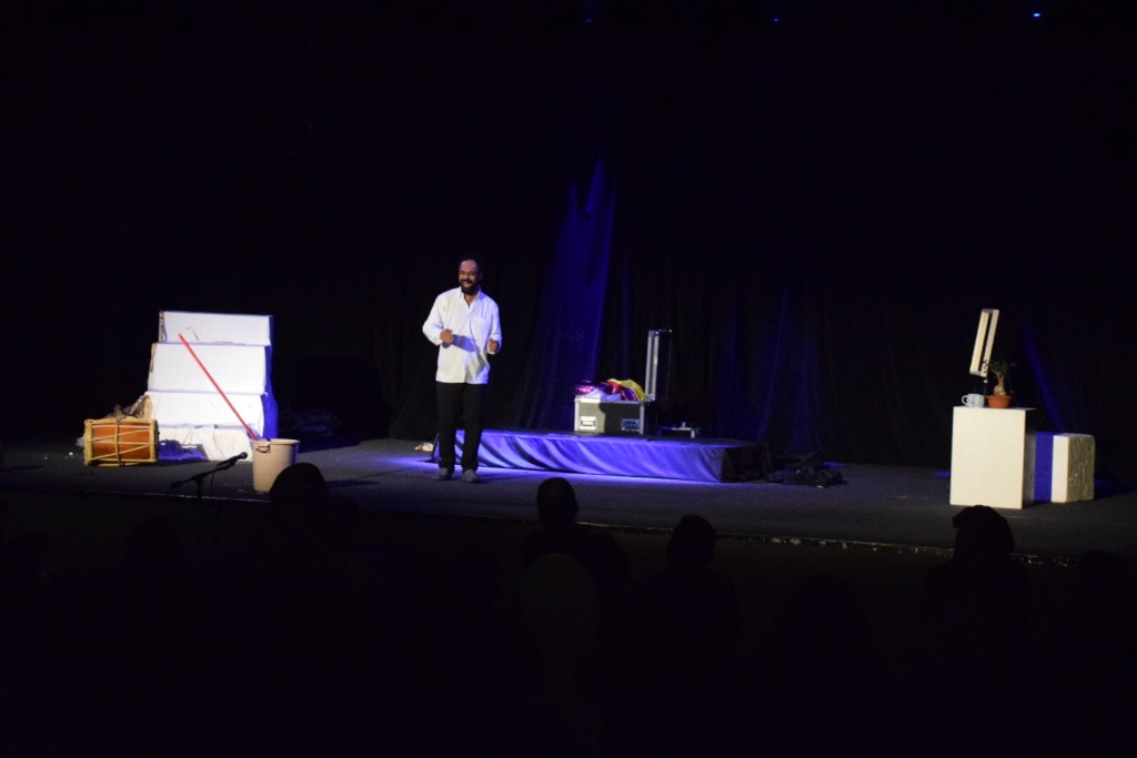 ثم قدم عرض الافتتاح ”كومبارس“ للكاتب فهد الحوشاني واخراج عبدالله الحسن وتمثيل عصام البريمان، والذي لامس مشاعر الفنانين المسرحيين بالتطرق لمعاناة الفنان المسرحي.