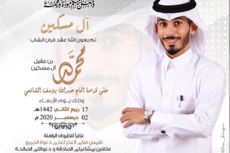 احتفلت عائلة آلمسكين والشافعي في سيهات بعقد قران الشاب محمد عقيل آل مسكين على كريمة الحاج عبدالله يوسف الشافعي وسط فرحة الأهل والأصدقاء ومحبي العريسين.