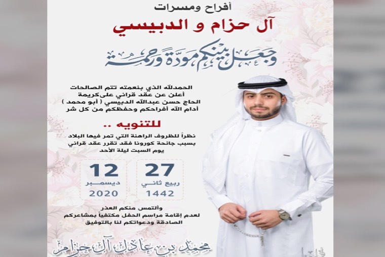 تحتفل عائلة آل حزام والدبيسي في صفوى مساء يوم السبت بعقد قران الشاب محمد عادل آل حزام على كريمة الحاج حسن عبدالله الدبيسي وسط فرحة الأهل والأصدقاء ومحبي العريسين.