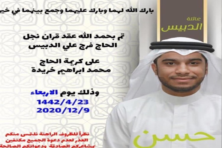 احتفلت عائلة الدبيس وخريدة في سيهات مساء يوم الأربعاء بعقد قران الشاب حسن فرج علي الدبيس على كريمة الحاج محمد ابراهيم خريدة وسط فرحة الأهل والأصدقاء ومحبي العريسين.