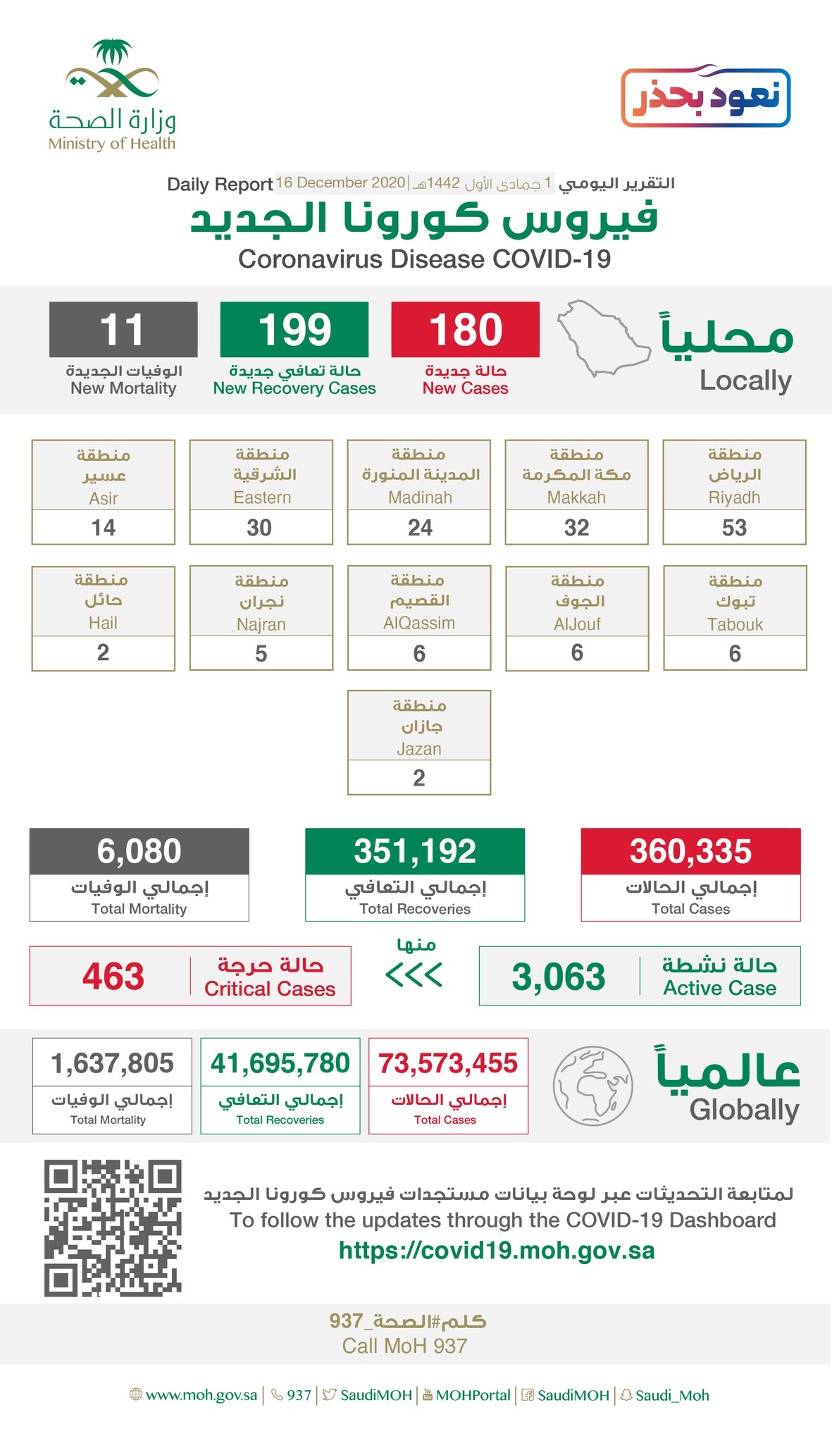أعلنت وزارة الصحة، اليوم الاربعاء عن تسجيل «180» حالة إصابة جديدة بفيروس كورونا المستجد خلال ال 24 ساعة الماضية منها ”2“ في القطيف، ليرتفع إجمالي عدد الإصابات المسجلة في المملكة إلى «360335» حالة.