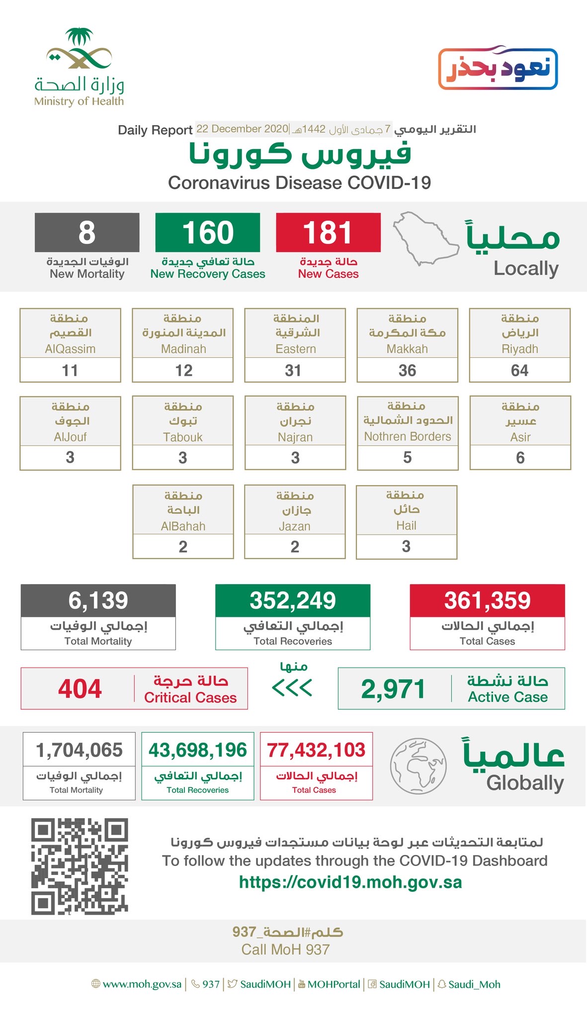 الصحة تسجل «181» إصابة جديدة بكورونا.. منها ”3“ في القطيف