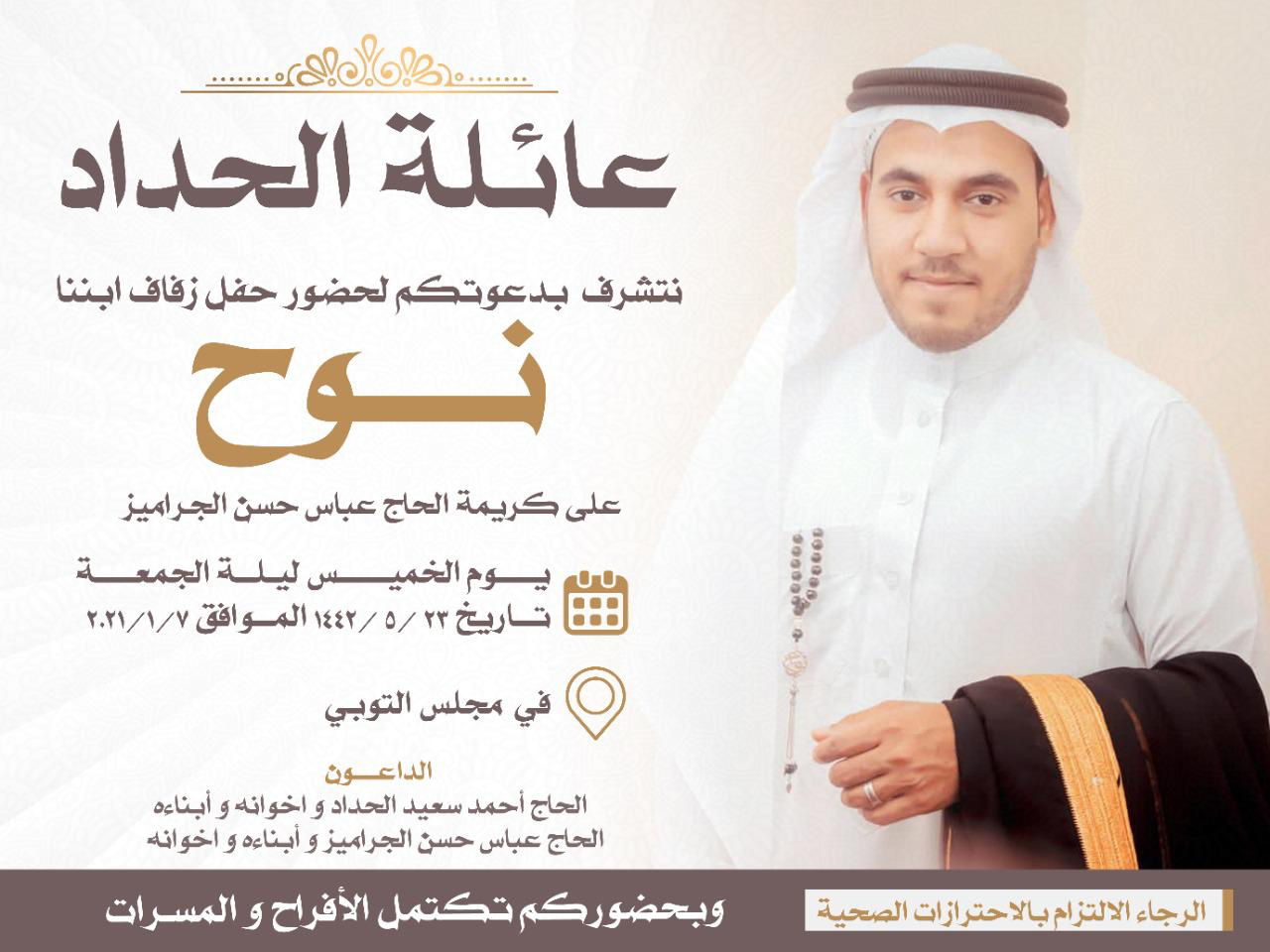 تحتفل عائلة الحداد والجراميز في التوبي مساء يوم الخميس بزفاف الشاب نوح أحمد سعيد الحداد على كريمة الحاج عباس حسن الجراميز في مجلس التوبي وسط فرحة الأهل والأصدقاء ومحبي العريسين.