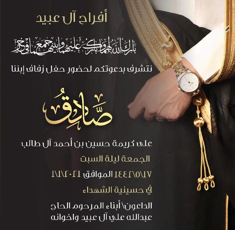 تحتفل عائلة آل عبيد وآل طالب في القديح مساء يوم الجمعة بزفاف الشاب صادق عبدالله علي آل عبيد على كريمة الحاج حسين أحمد آل طالب في حسينية الشهداء بالقديح وسط فرحة الأهل والأصدقاء ومحبي العريسين.
