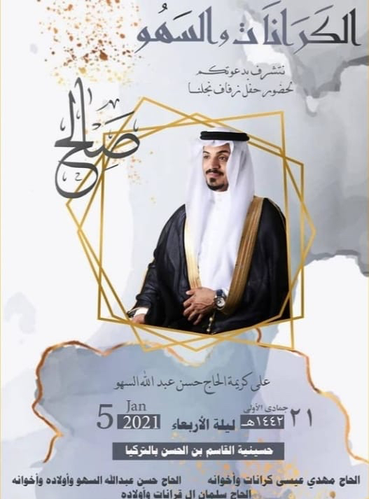 تحتفل عائلة الكرانات والسهو في تاروت مساء يوم الثلاثاء بزفاف الشاب صالح مهدي عيسى الكرانات على كريمة الحاج حسن عبدالله السهو في حسينية القاسم بن الحسن بالتركيا وسط فرحة الأهل والأصدقاء ومحبي العريسين.