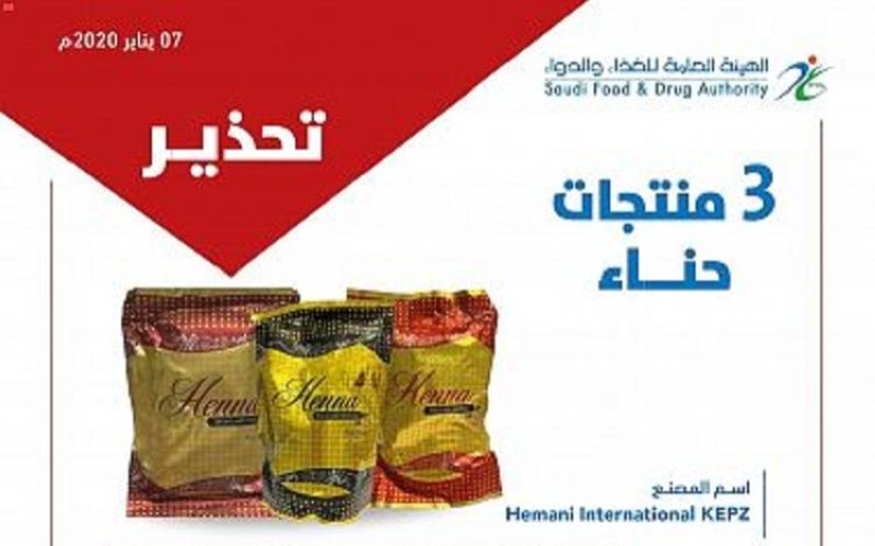 أصدرت الهيئة العامة للغذاء والدواء تحذيرا شديد اللهجة بشان 3 منتجات من الحناء بسبب احتوائها على نسبة عالية من البكتيريا والفطريات تجاوزت الحد الأقصى المسموح به.