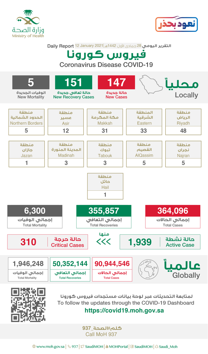 الصحة تسجل «147» إصابة جديدة بكورونا.. منها ”4“ في القطيف و”1“ بصفوى