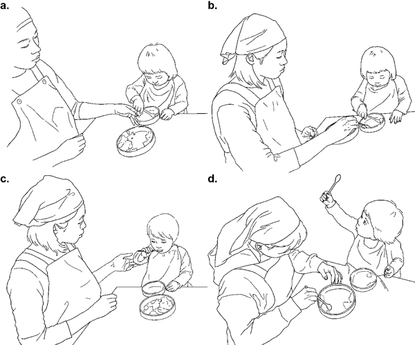 تم إجراء دراسة، رصدية طولية مدتها 10 أشهر لـ 12 مجموعة ثنائية متكونة من طفل دارج ومقدم رعاية خلال أوقات الوجبات في مركز للرعاية النهارية في اليابان. حُددت بداية التغذية بالملعقة التي يقوم بها الدارج بشكل مستقل لكل طفل دارج «متوسط ​​عمره: 17,88 شهرًا». بعد ذلك درس الباحثون العلاقة الزمانية بين المصطلحات التالية في بيانات فيديو أوقات الوجبات فورًا بعد هذه البداية:
