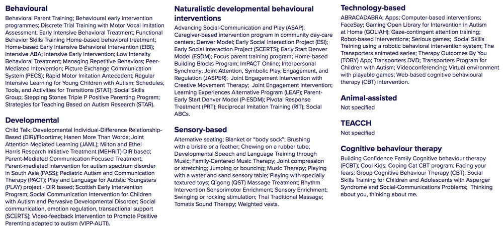 تم إعداد التقرير من قبل فريق متنوع من الباحثين ونشره مركز البحوث التعاوني للتعايش مع التوحد Autism CRC «انظر [2] »، التقرير يشرح الأنواع المختلفة من التدخلات التي نُظمت في تسع فئات. ويلخص أيضًا أيًا من هذه التدخلات مدعوم بأدلة بشكل جيد وأيًا منها ليس كذلك.