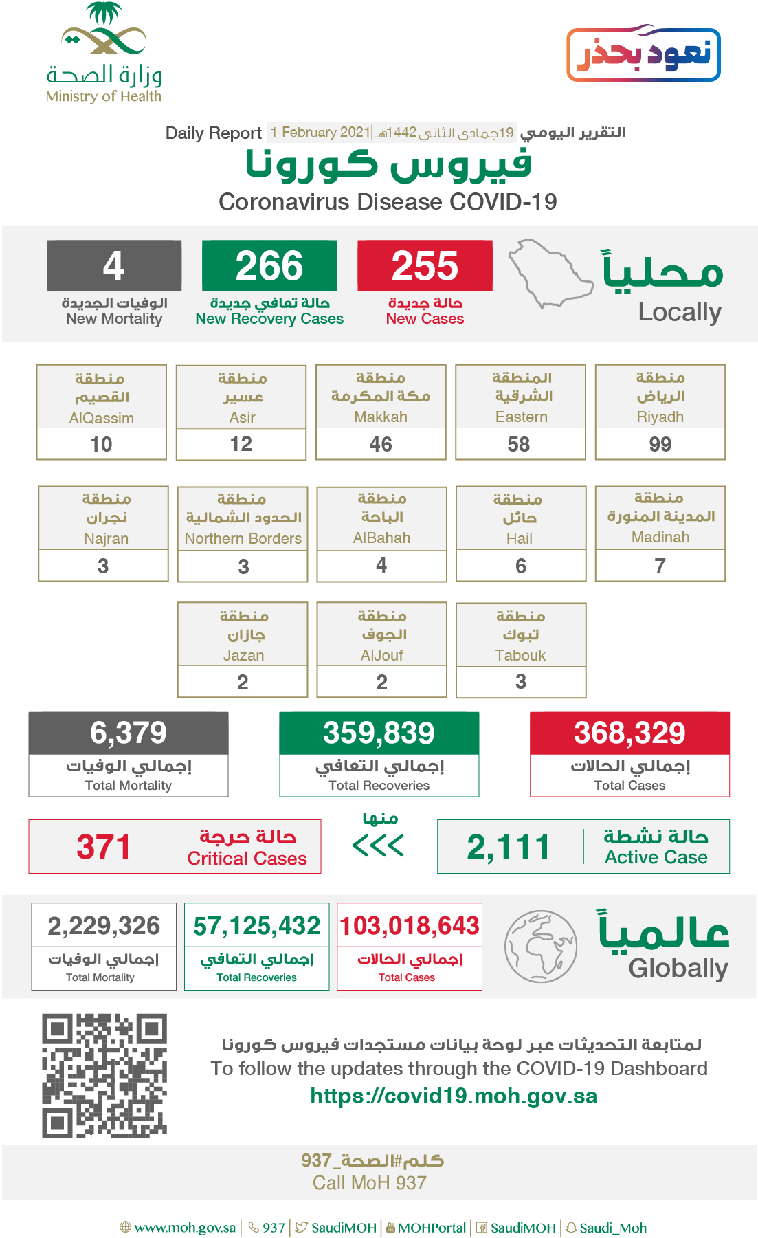 كما أعلنت الصحة عن تسجيل ”266“ حالة تماثلت للشفاء، ليصل مجموع المتعافين إلى ”359839“ حالة تعافي، فيما ارتفع إجمالي الوفيات في المملكة إلى ”6379“ حالة بعد تسجيل ”4“ حالة وفاة جديدة