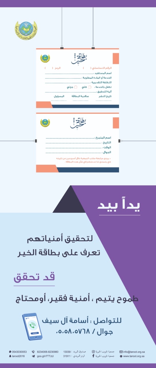 يشار إلى إن فكرة”بطاقة الخير“تم إطلاقها بداية عام 2020 لتساهم في سد بعض الاحتياجات الطارئة التي تقدمها الجمعية وتفتح المجال للمساهمة من قبل المتبرعين في سد هذه الحالات بشكل مباشر، ليتبناها أهل الخير من أبناء المجتمع، وهي أيضا متاحة للمستفيدين من خدمات الجمعية ولغيرهم ممن يتقدم بطلب المساعدة عبر التواصل المباشر مع مكتب الجمعية وقنواتها المعروفة.