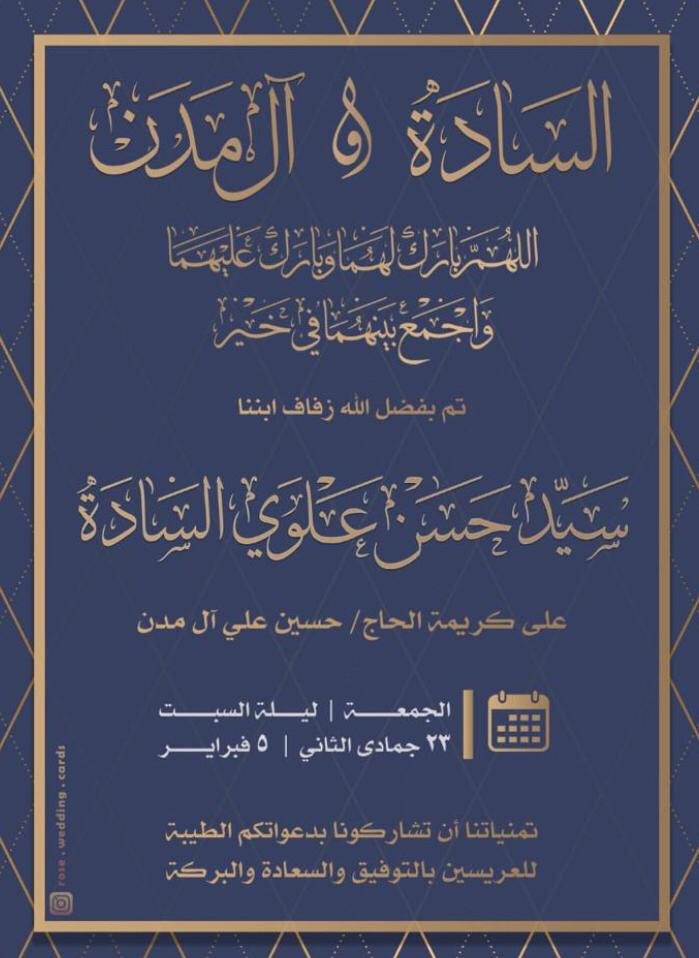 احتفلت عائلة السادة وآل مدن في سيهات مساء يوم الجمعة بزفاف الشاب السيد حسن علوي السادة على كريمة الحاج حسين علي آل مدن وسط فرحة الأهل والأصدقاء ومحبي العريسين.