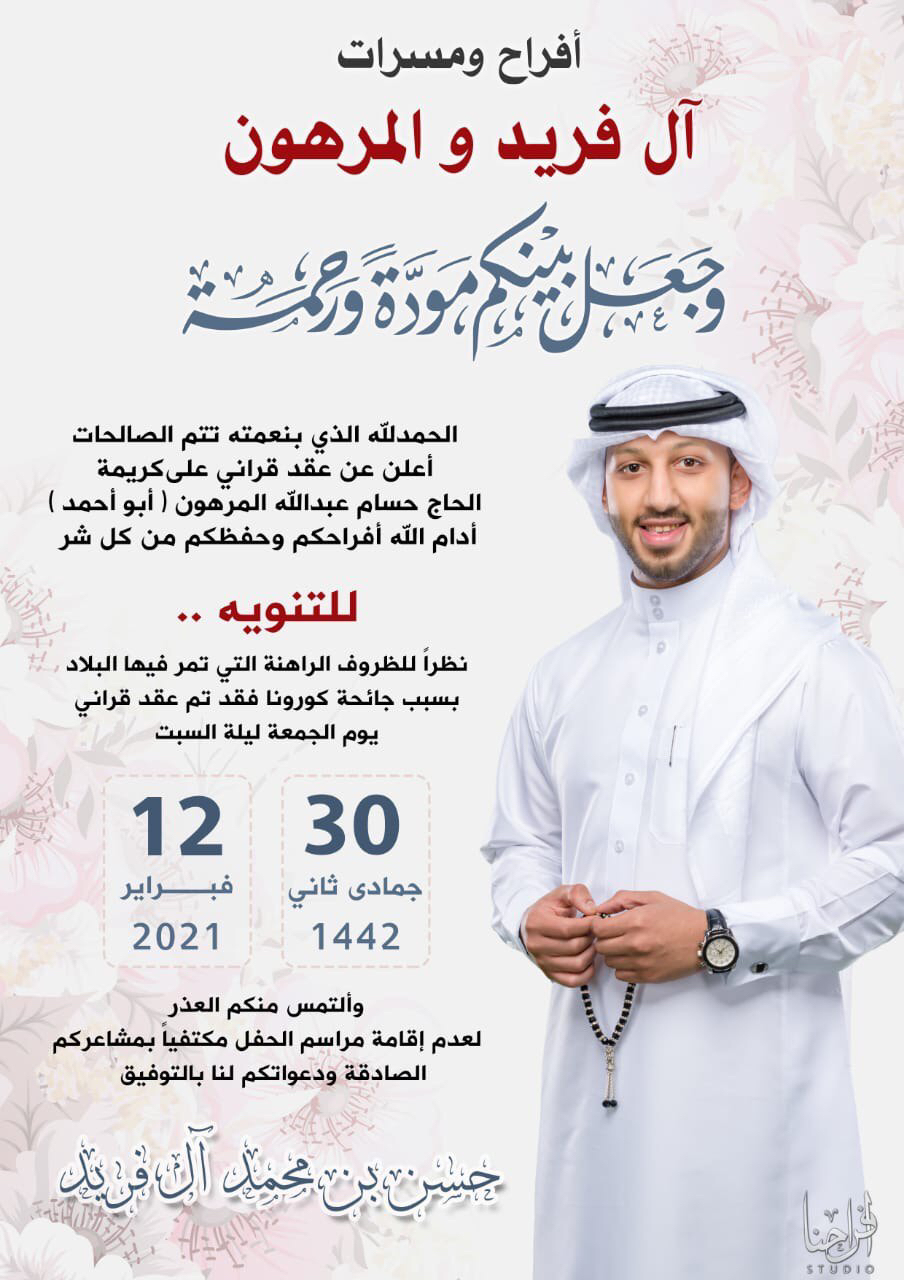 احتفلت عائلة آل فريد والمرهون في صفوى مساء يوم الجمعة بعقد قران الشاب حسن محمد آل فريد على كريمة الحاج حسام عبدالله المرهون «أبو أحمد» وسط فرحة الأهل والأصدقاء ومحبي العريسين.