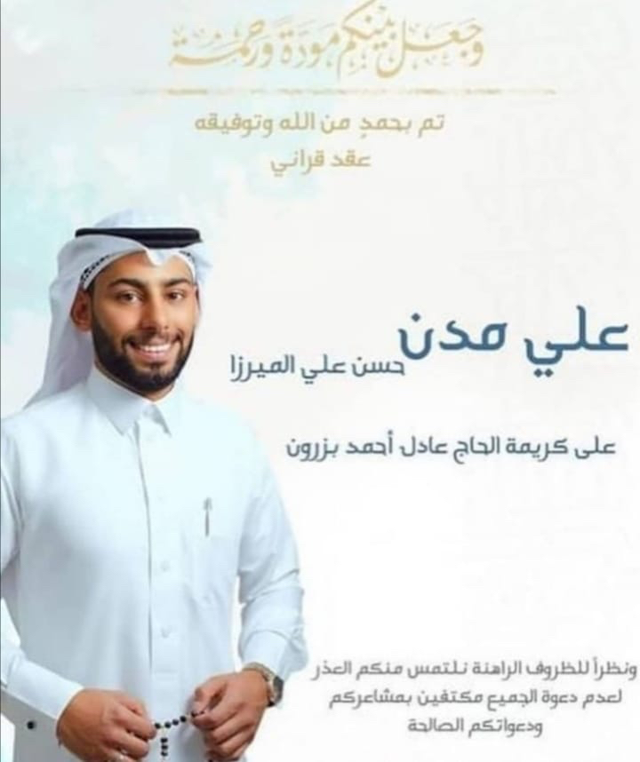 احتفلت عائلة الميرزا وآل بزرون في سيهات مساء يوم الجمعة بعقد قران الشاب علي مدن حسن علي الميرزا على كريمة الحاج عادل أحمد آل بزرون وسط فرحة الأهل والأصدقاء ومحبي العريسين.
