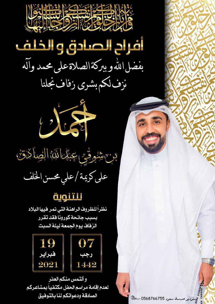تحتفل عائلة الصادق والخلف في صفوى مساء يوم الجمعة بزفاف الشاب أحمد شوقي عبدالله الصادق على كريمة الحاج علي محسن الخلف وسط فرحة الأهل والأصدقاء ومحبي العريسين.